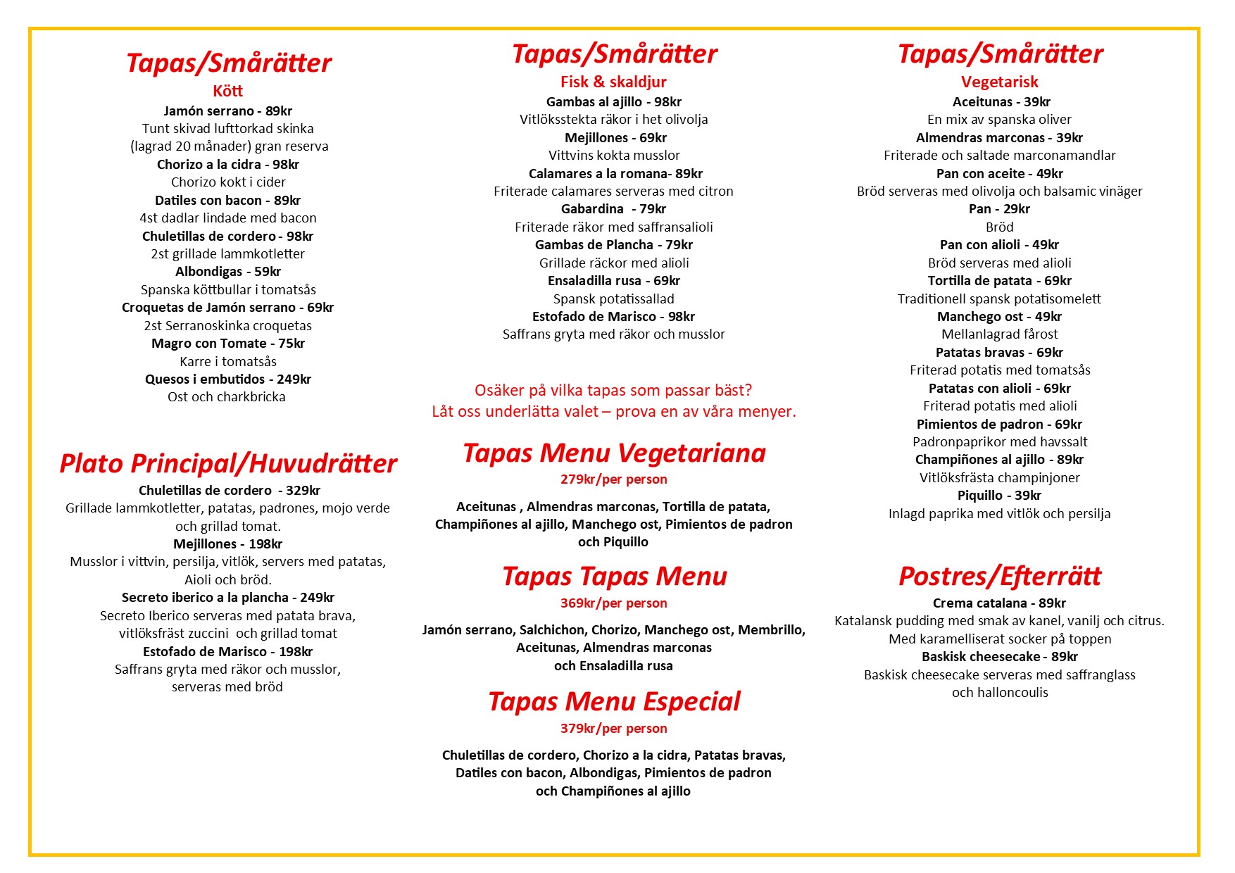 Tapas Tapas är en charmig spansk tapasbar och restaurang i hjärtat av Norrköping där äkta spanska smaker möter en livlig atmosfär. Med en mångfald av tapas, från klassiska patatas bravas till mustiga charkuterier, tar vi dig med på en smakresa till Spanien. Upplev inte bara maten utan även en plats där musik och skratt samlas regelbundet för en oförglömlig kväll.